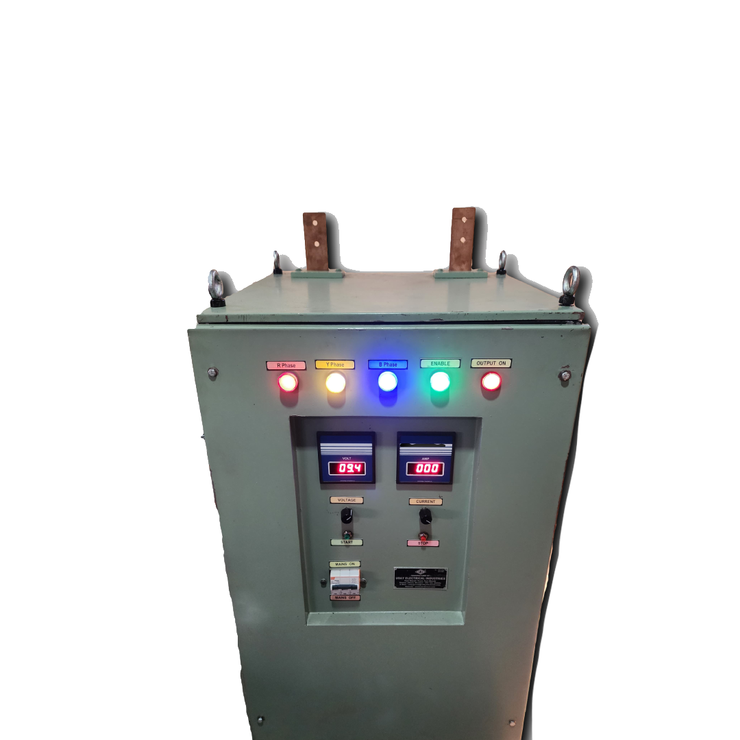 3 phase 415V AC fed into auto variac regulator. Regulated output 0 to 415V AC connected to oil cooled step down transformer with oil immersed diode rectifier at secondary side of transformer.